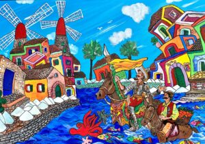 Antonello trasporta Don Chisciotte e il fido Sancho Panza nel cuore di un borgo fantastico, popolato da mulini a vento giganteschi e case sghembe dalle tonalità fauviste. Le strutture architettoniche si piegano e si torcono come se seguissero il ritmo interiore dei personaggi, tra le onde azzurre di un mare animato da creature marine stilizzate. Ogni pietra, ogni porta verde o viola, è una pennellata emotiva che racconta un mondo che rifiuta la rigidità del reale per abbracciare la potenza dell’immaginazione.