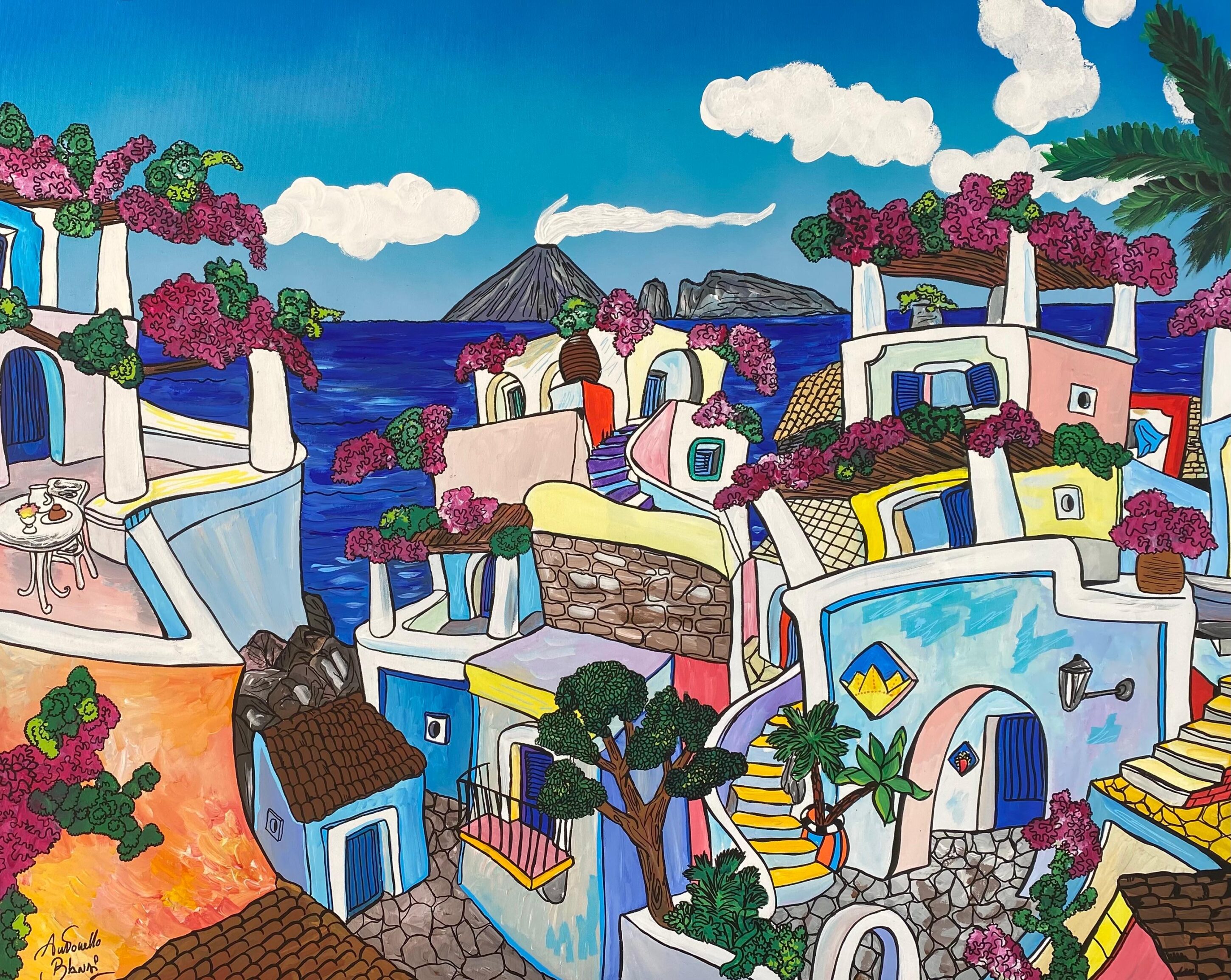 C’è un momento dell’estate, quando il sole si abbassa e l’aria sa di sale, fichi e musica lontana, in cui Panarea smette di essere isola e diventa sensazione. In quest’opera, Antonello Blandi cattura esattamente quel momento: il battito leggero della giornata, tra una terrazza fiorita e il richiamo di un bicchiere ancora pieno.