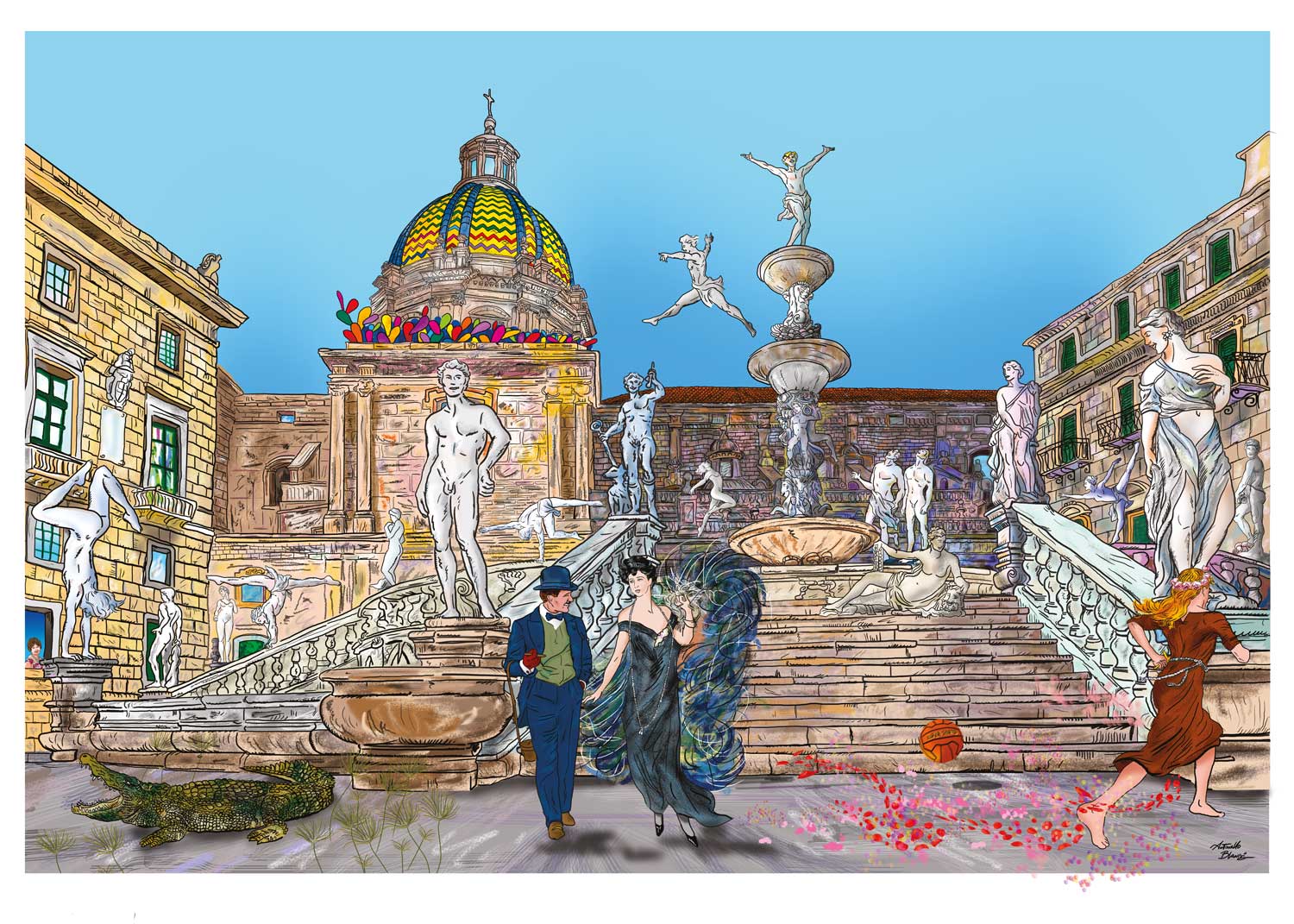L’opera rappresentare la fontana Pretoria di Palermo che per incanto prende vita in un corale inno alla gioia; accade solo in determinati giorni, in cui il nostro animo è predisposto a sognare e a fantasticare. Le sculture danzano nell’aria magica della piazza, dove appare la coppia regina della Palermo che fu, Ignazio e Franca Florio, mentre i papiri spuntano dal basolato accanto al coccodrillo che viveva nel fiume a simboleggiare le antiche leggende.. Un pallone rimbalza sui gradini dedicato alla spensieratezza della gioventù. Una bellissima Santuzza corre lasciando dietro di sè scie di petali di rose, mentre fichidindia multicolori spuntano sulla cupola che sovrasta tutto